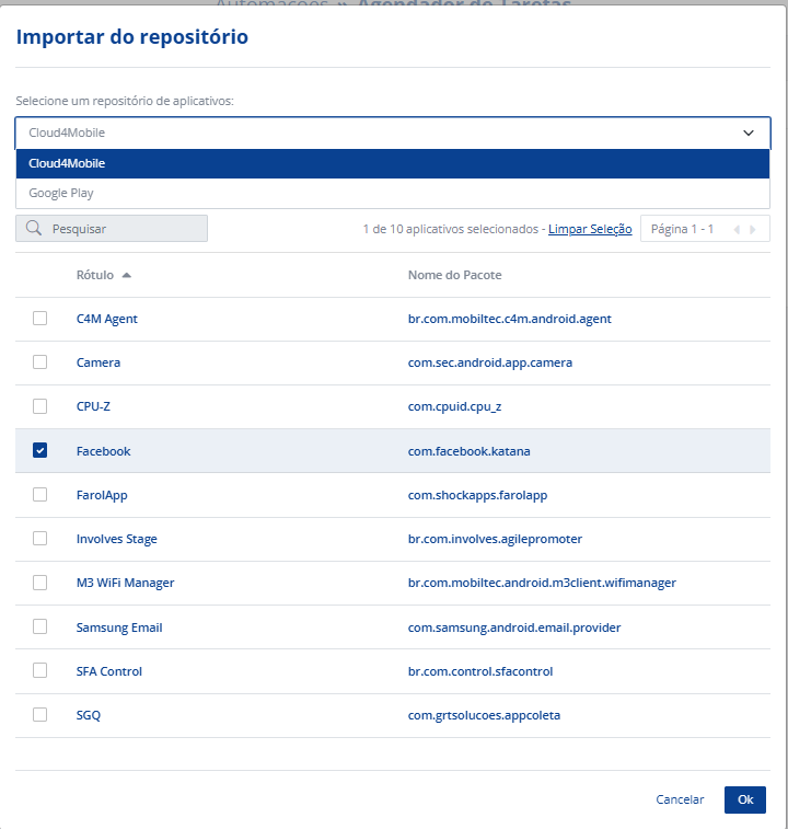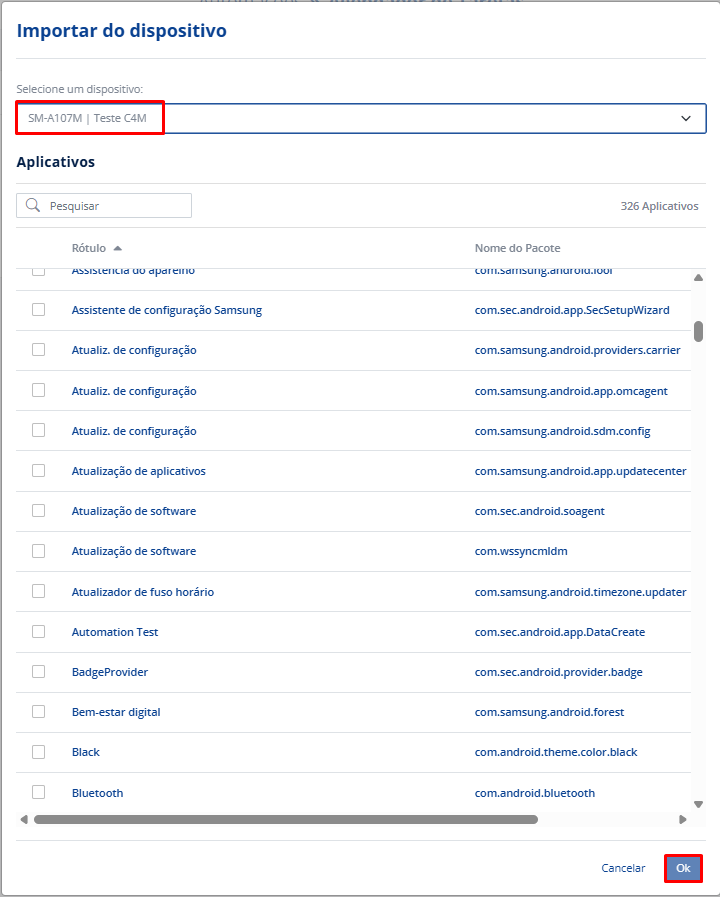 Se você escolher a opção “Dispositivo“, você será direcionado para a lista de todos os dispositivos cadastrados no ambiente. Selecione um aparelho e será mostrado todos os apps daquele aparelho. Basta seleciona o app desejado e clicar em “Ok“.