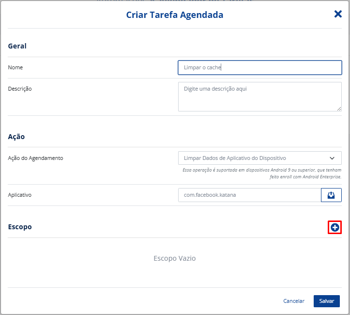 Surgirá a janela mostrada na imagem abaixo. Preencha os dados como nome, descrição (opcional) e em “Ação” escolha a opção “Limpar Dados de Aplicativo do Dispositivo“.