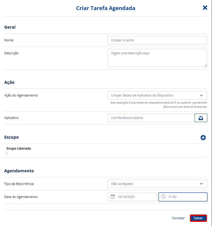 A última etapa é a definição do agendamento quando a tarefa será executada nos dispositivos. Defina a recorrência e a data de início da execução. Por fim, clique em “Salvar“.